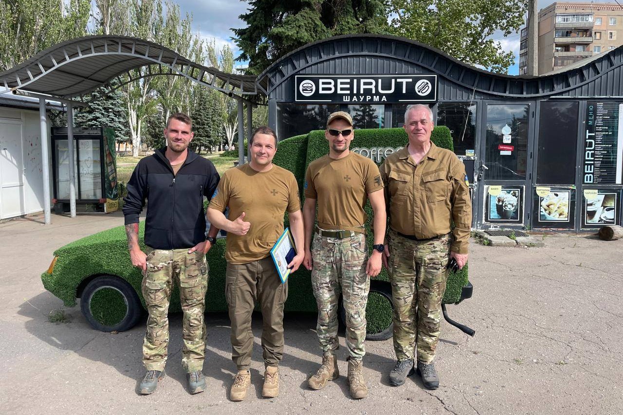 Nick R-N og Jens Alstrup fra Frihed for Ukraine med Ivan Kravtsov og Shamil Krutkov (Kommandør for Ukraines 93. Brigade), Juni 2025 / Foto: FFU