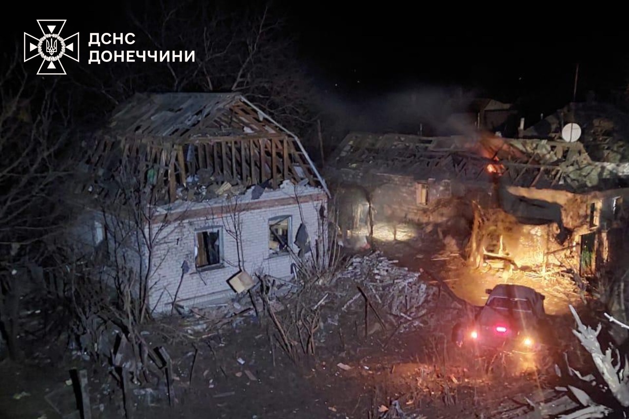 Russisk luftangreb på byen Sloviansk den 24 november 2025. 5 personer såret, heriblandt to børn. To lejlighedsbygninger og et privat hus blev beskadiget, såvel som en lokal virksomhed. En garage og et affaldsværk brød i brand./ Foto: State Emergency Service of Ukraine
